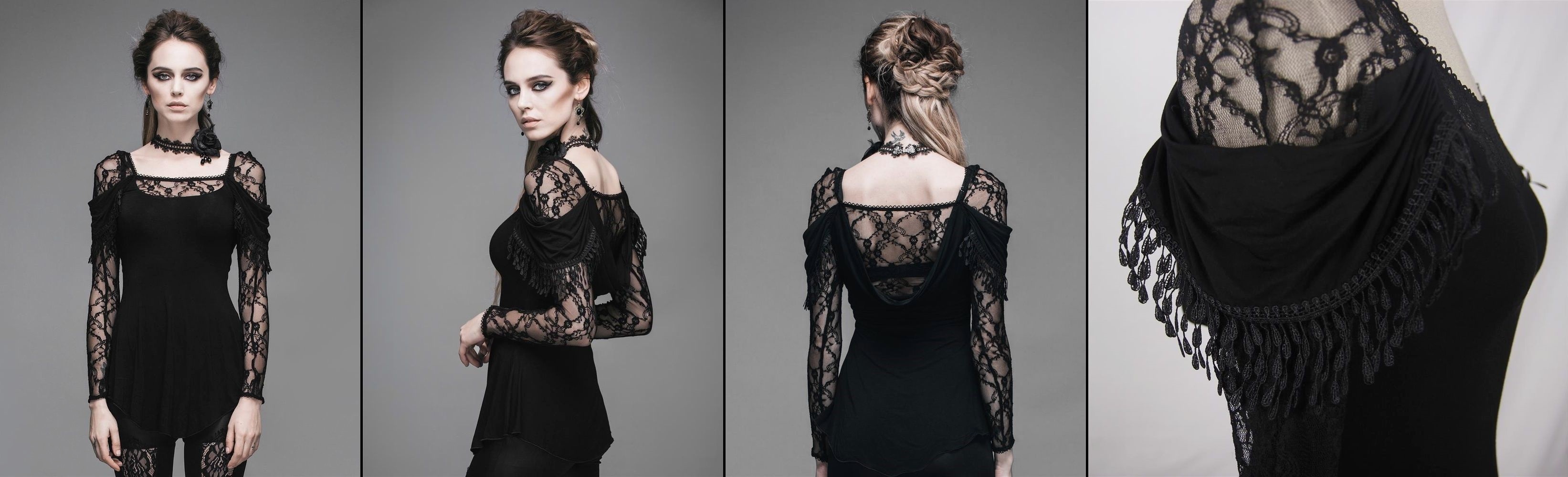 materiál: 95% bavlna, 5% elastan design: černá barva, krajkové rukávy a výstřih, pod rameny nabírané látkové vsadky zdobené krajkovými střapci pro vytvoření ultra gotického vzhledu, na zádech hluboký výstřih velikostní tabulka: A
