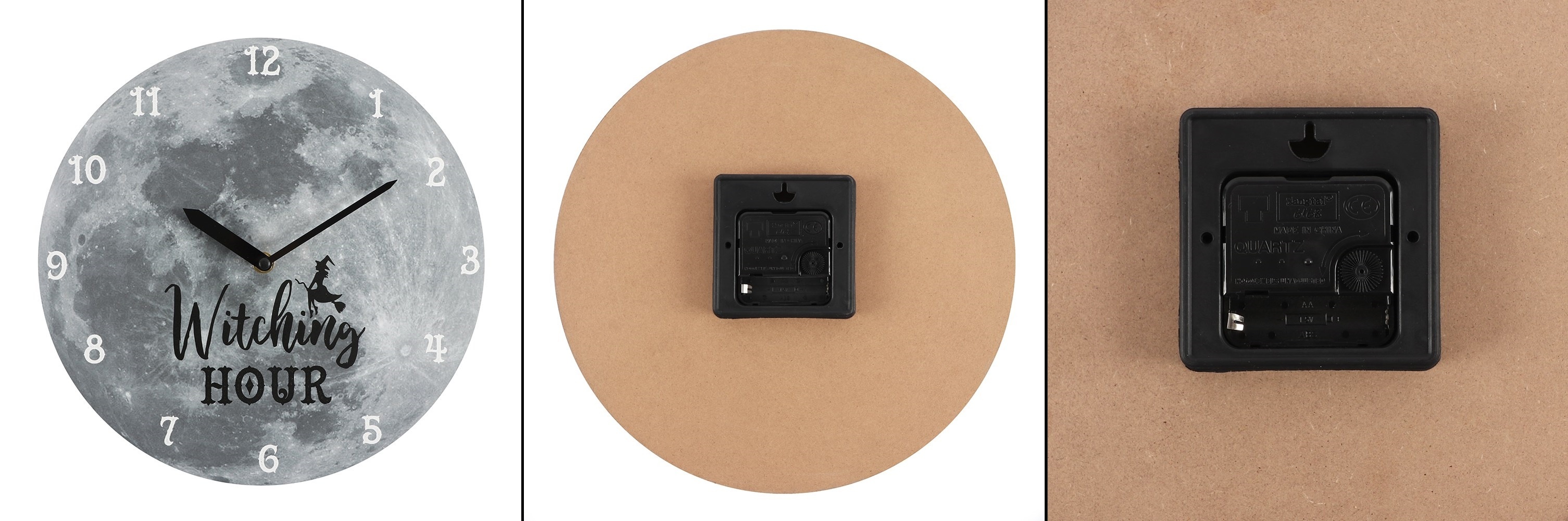 materiál: MDF design: čarovné hodiny s motivem čarodějnice na koštěti letící za úplňku, hodiny jsou vyrobeny z potištěného laminátu, k provozu je zapotřebí 1x AA baterie, která není součástí balení rozměry: průměr 28 cm, hloubka 2,5 cm