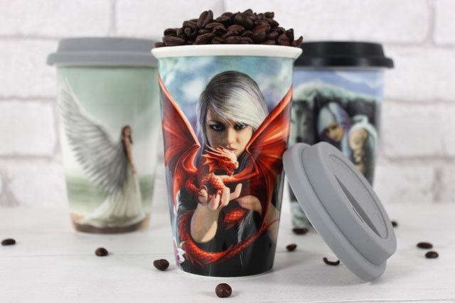 materiál: porcelán, guma design: cestovní hrnek s motivem od umělkyně Anne Stokes, kompletní s izolovaným gumovým víkem, vhodný do myčky nádobí i mikrovlnné trouby rozměry: výška 15 cm, průměr 9 cm