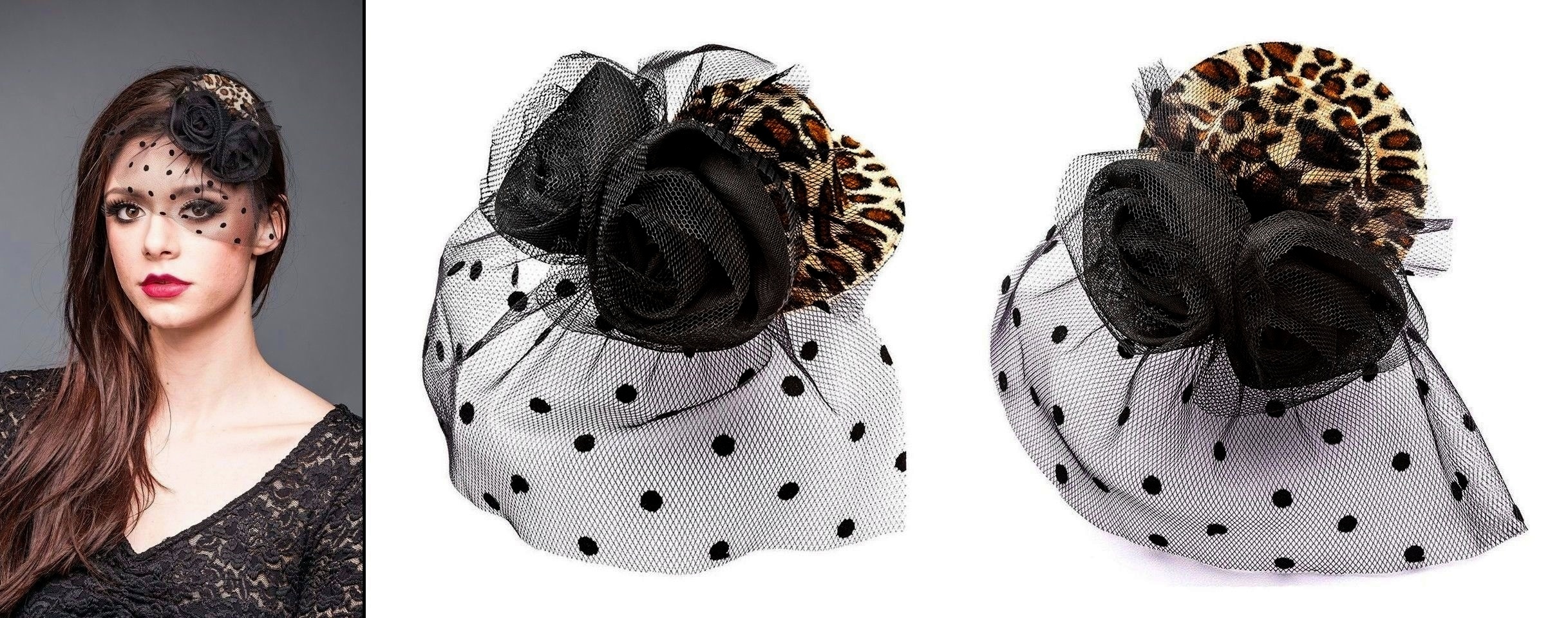 materiál: polyester design: leopardí dámský klobouček do vlasů se dvěmi růžemi a závojem, ve spodní části je jedna kovová spona sloužící k uchycení, dodáváno v krabičce rozměry: průměr 8 cm