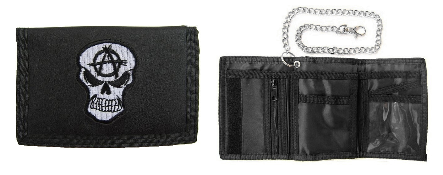 materiál: koženka, polyester design: černá peněženka s výšivkou lebky s anarchy symbolem a kovovým řetízkem, zapínání na suchý zip, uvnitř množství úložných kapes, na zadní straně kapsa na zip rozměry: výška 9 cm, šířka 13 cm