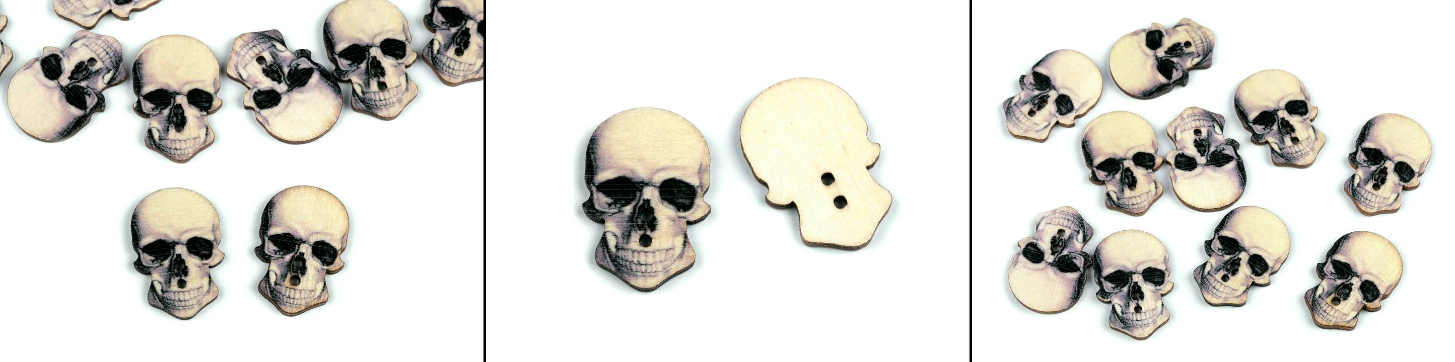 materiál: dřevo design: dřevěný lakovaný dekorační knoflík ve tvaru lebky, motiv je jednostranný, prodáváno po 1 ks rozměry: výška 2,8 cm, šířka 1,9 cm, tloušťka 0,2 cm