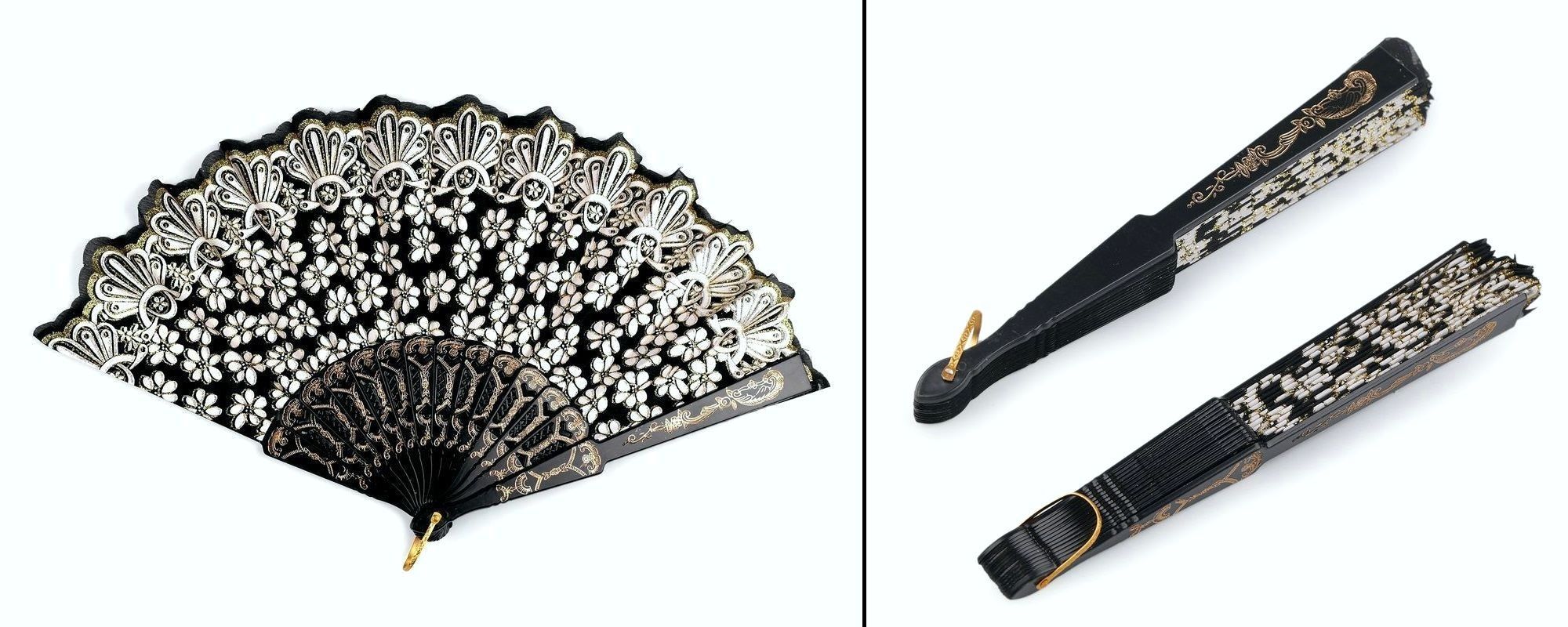 materiál: polyester, plast, kov design: černý látkový vějíř s bílým květinovým potiskem a zlatými glitry, plastová rukojeť s poutkem zdobená zlatými ornamenty rozměry: délka 24 cm, šířka cca 42 cm