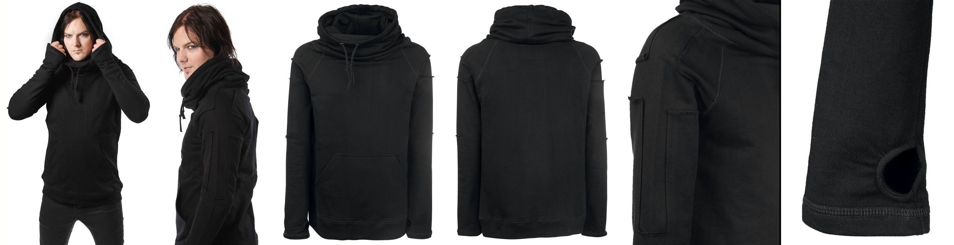 materiál: 95% bavlna, 5% lycra design: černá barva, na rukávech aplikace - kříž, velký rolákový límec možno využít jako kapuci, klokaní kapsa, na rukávech otvory na palce velikostní tabulka: B